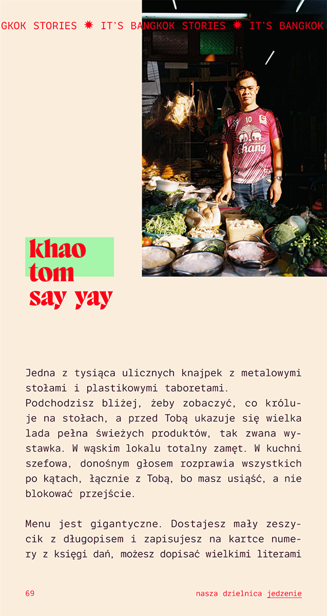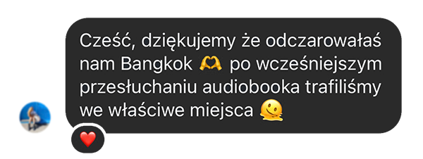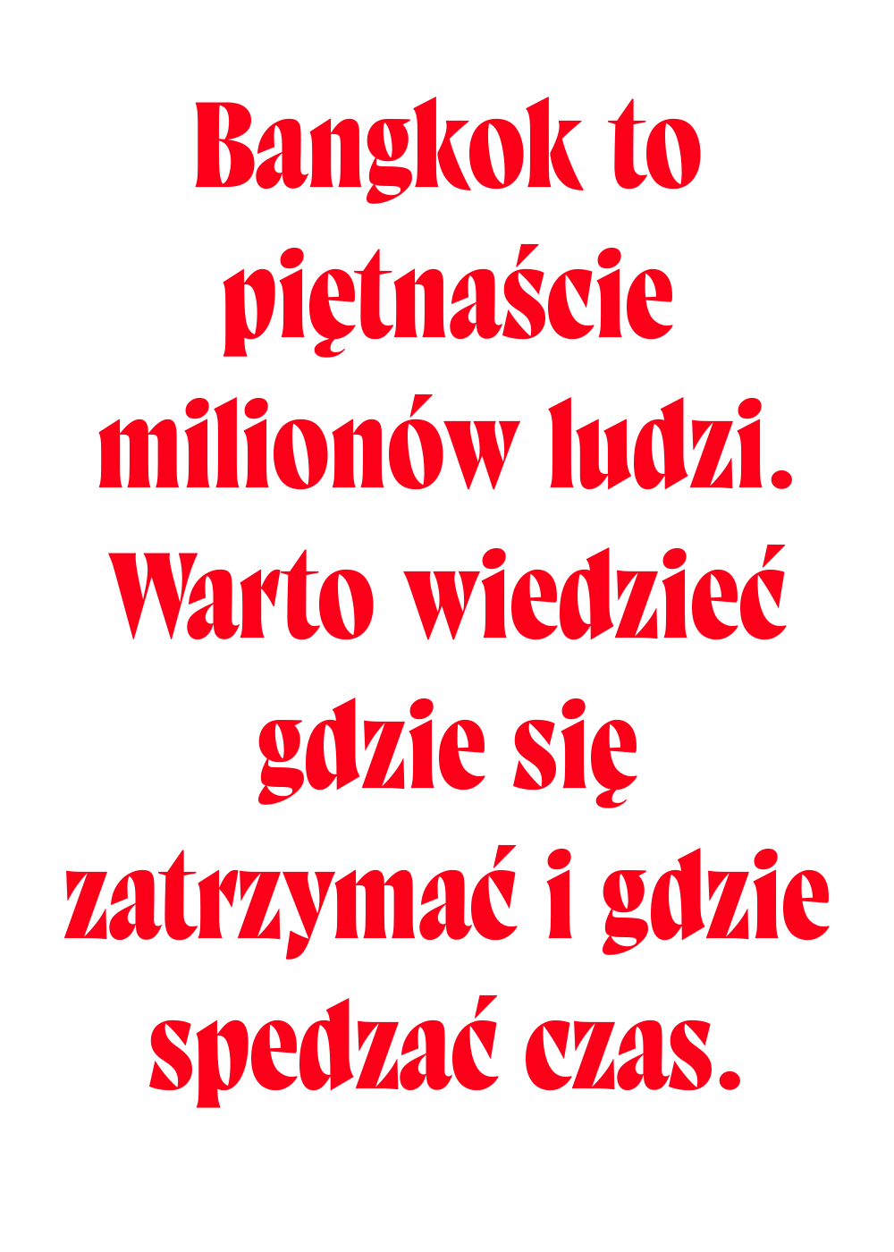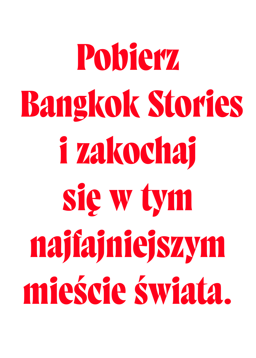Bangkok uczy dystansu, życia z przymrużonym okiem i umiejętności puszczania oczka. W weekendy chodzimy do tej samej kawiarni – nie dla kofeiny, a dla niekończących się rozmów z Mr. Pumpui, który, tak jak my, kocha Bangkok. Liczymy warany wylegujące się w słońcu pod naszymi oknami. Chodzimy do świątyń tuż przed zamknięciem, po to, żeby w ostatnich minutach zwiedzać je samemu. W drodze do domu łapiemy banana z grilla, popijamy zimnym kokosem i jedziemy dalej. Stoimy w palących żarem korkach, wypacając przy tym wiadra potu. Przesiadujemy w restauracjach, w których czasami trzeba przenieść swój stolik kilka metrów dalej, bo na naszym miejscu chce akurat zaparkować samochód. Pływamy łódką po kanałach, którą dotrzeć można niemalże wszędzie i bez korków. Marzniemy w klimatyzowanych wagonach naziemnych i podziemnych kolejek, obserwując stylówki ludzi z całego świata. Jeździmy nocą po mieście. Jak w grze komputerowej, slalomami i skrótami przecinamy zakorkowane ulice. Dwa poziomy betonowych węży wiją się nad naszymi głowami, jakby chciały przejąć kontrolę nad miastem, a my prujemy dalej przez mosty i ulice na drugi koniec miasta, czasami bez celu, po prostu dla frajdy. Bo życie w Bangkoku to dla nas jedna wielka frajda. Jakbyśmy zeszli z powagi i wieku. Jakbyśmy na nowo byli dzieciakami.
