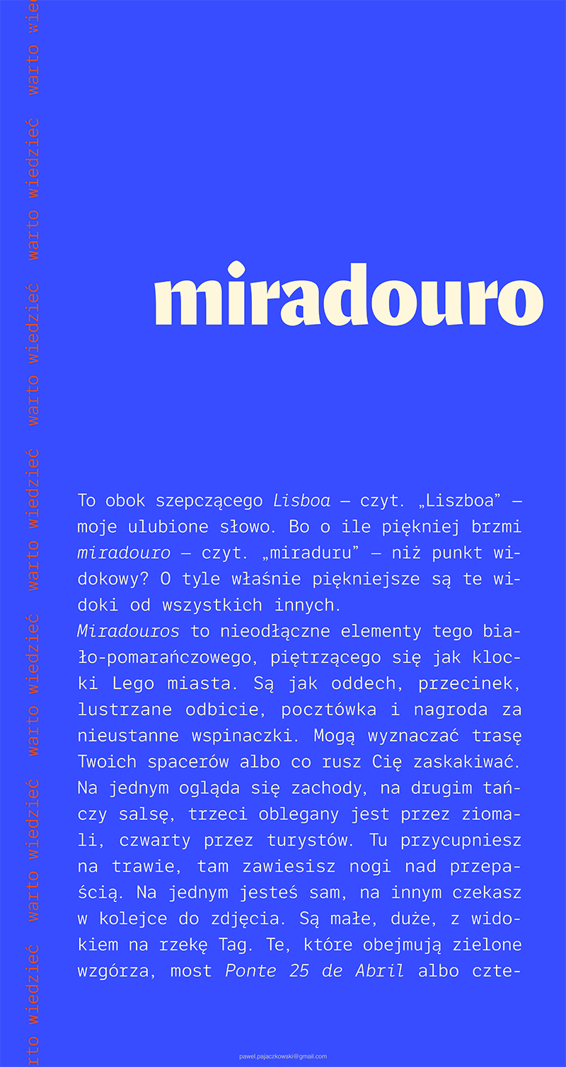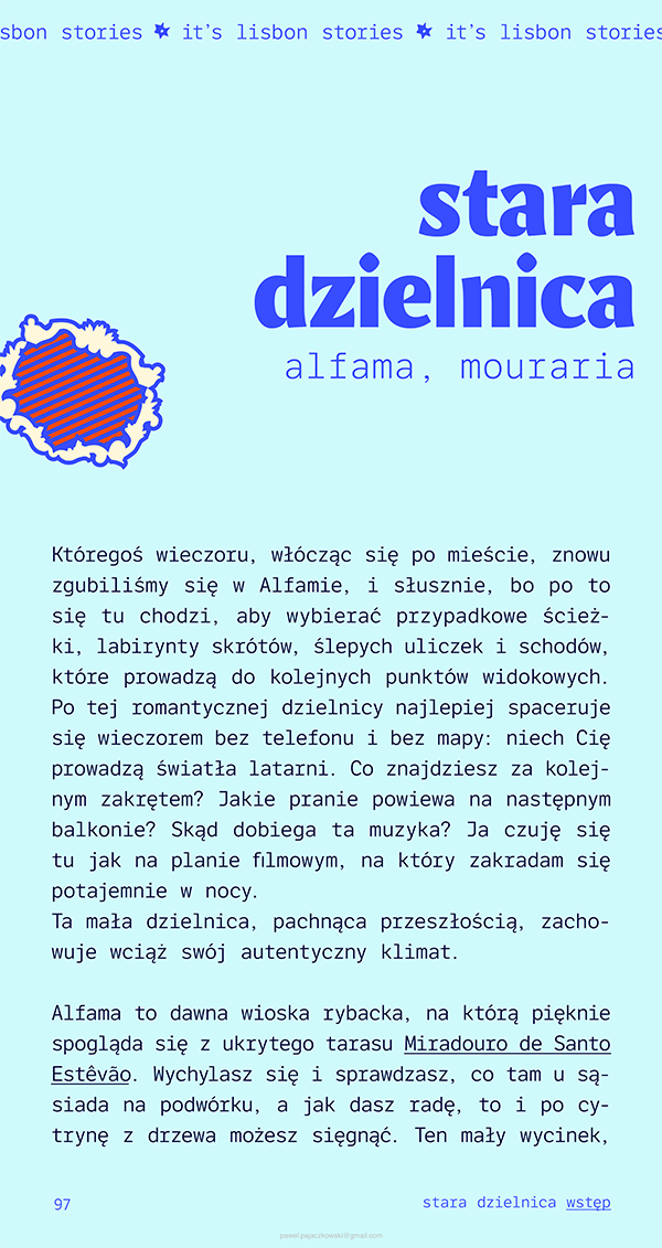 Przez ostatnie miesiące zrobiliśmy setki kilometrów po stolicy Portugalii. Wydaje nam się że odwiedziliśmy każdy jej zakamarek. Poznaliśmy właścicieli restauracji, barów i klubów. Zjedliśmy setki portugalskich deserów, przeleżeliśmy godziny w parkach i na miejskich plażach. Spróbowaliśmy wszystkich tradycyjnych dań z dorsza. Tańczyliśmy do samby i do rana przy elektronice. Pływaliśmy żaglówką po Tagu, zabłądziliśmy kilka razy w lasach Sintry. Znaleźliśmy najsmaczniejsze kraby i ciągnące się tosty z serem i szynką, popijaliśmy wszędzie małe piwka i niesamowite naturalne wina. Gubiliśmy się w starych dzielnicach, podążając za muzyką. Oglądaliśmy Lizbonę z dziesiątków punktów widokowych, znaleźliśmy park kaktusów, gdzie mieszkają dzikie kury i koguty. I, co najważniejsze, poznaliśmy zwyczaje i przyzwyczajenia Portugalczyków. Staraliśmy się je zrozumieć i opisać. To wszystko znajdziecie w Lisbon Stories